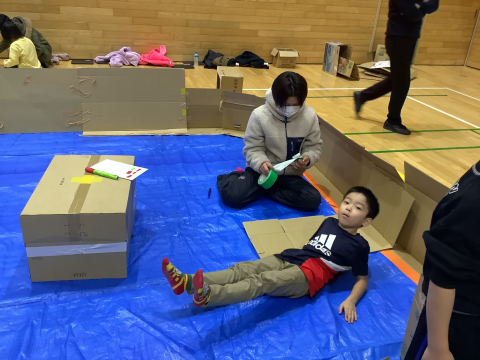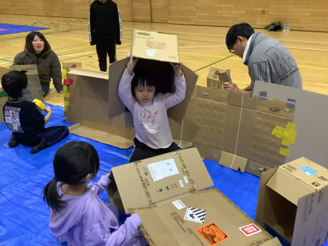 子どもたちは、「ここに入口を作ろう!」「屋根もつけたいな」と、目を輝かせながらアイデアを出し合い、保護者の方と協力して作業を進めていました。完成した段ボールハウスに入って遊ぶ姿からは、大きな達成感と喜びが伝わってきました。