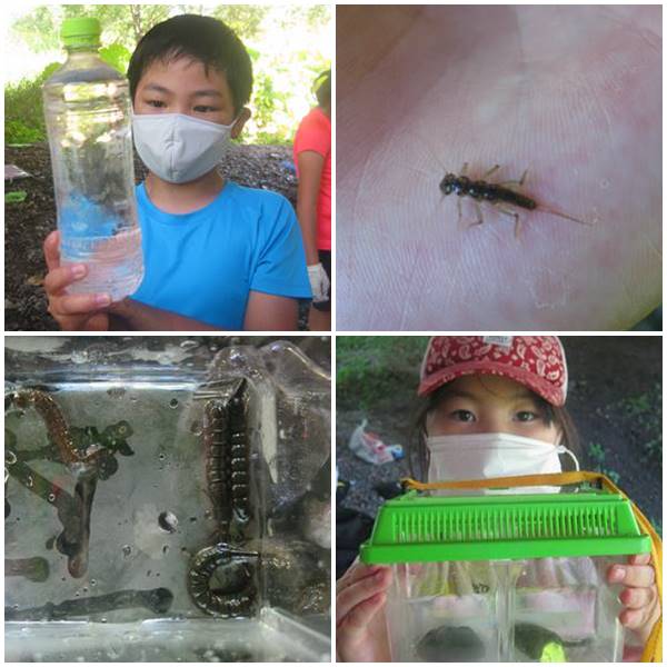 また,自分達が考えた方法で水質判断をしている子もいました。持参したペットボトルに水を入れ,透明度を調べています。見た目判断ではありますが,「めっちゃきれい!濁ってない!」とペットボトルを見せてくれました。にごりもなく,トビケラもたくさんいる・・・。つまり,やっぱりキレイだという結論です。