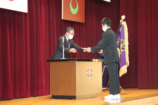 11月16日(金)に佐藤町長様、青木教育町長様をはじめ、教育委員や保護者の方々が来校され、佐藤町長様より4名の生徒に表彰状が手渡されました。表彰内容は、努力賞・奉仕賞・親切賞・努力賞です。