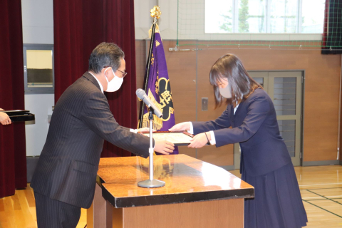 佐藤町長より7名の生徒が、それぞれの活躍にふさわしい賞をいただきました。