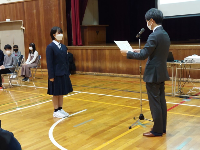 今年度、標茶町内の全小中学校で取り組んだ「絆づくりメッセージコンクール」において、本校の評議員が作成した「温かいコメントを増やそう SNS」が釧路管内の団体部門で最優秀賞を受賞しました。表彰式は11月26日(土)に北海道釧路商業高校で行われ、虹別中学校を代表して全生徒会長が出席し、釧路教育局長様より賞状を受け取りました。