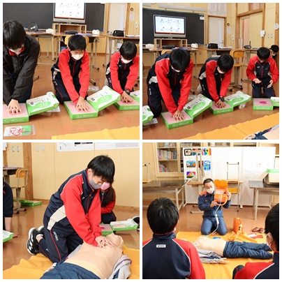 人間は心臓が止まるとどうなるのか。そのためにはどうすればいいのかをパソコンを使い説明してくれました。生徒は終始真剣な眼差しで聞き入っていました。