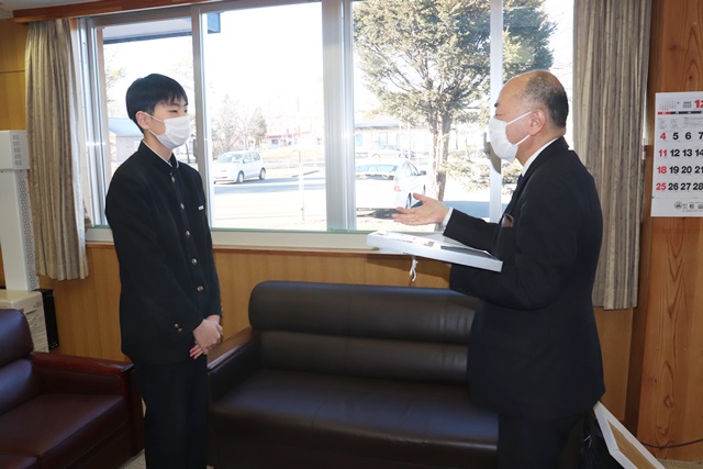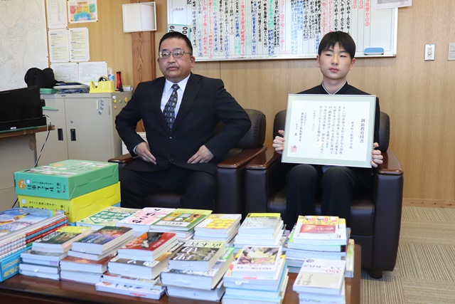 この度、本校校長室にて贈呈式を行い、生徒会長が代表して教育図書を受け取りました。