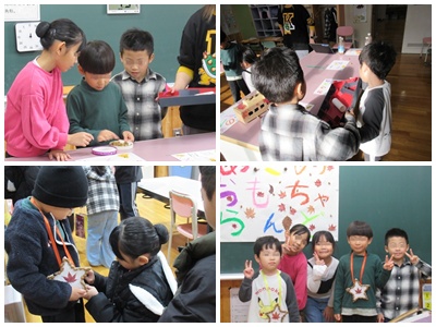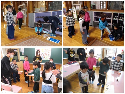 2年生3名が先生の代わりとなり、手作りゲームで一緒に遊んだり、校舎内を案内したりしました。