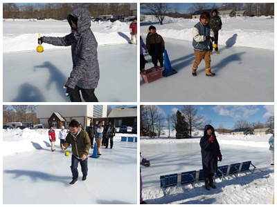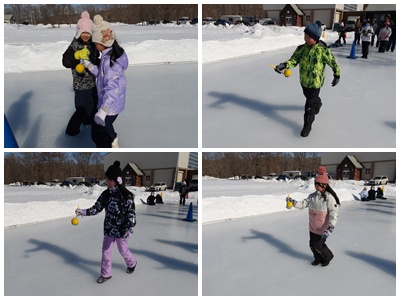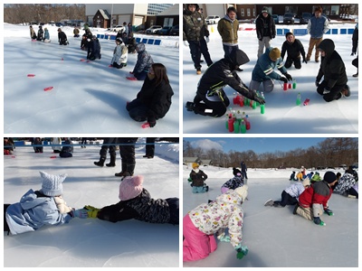 が勝ちという競技。氷上に散らばるペットボトルを一生懸命投げ続けた2分間、熱い戦いが来る広げられました。