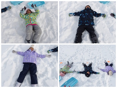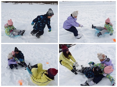 雪の上で寝転がったり、そりを引っ張り競争をしたりしました。
