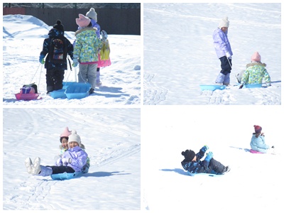 雪の上で寝転がったり、そりを引っ張り競争をしたりしました。