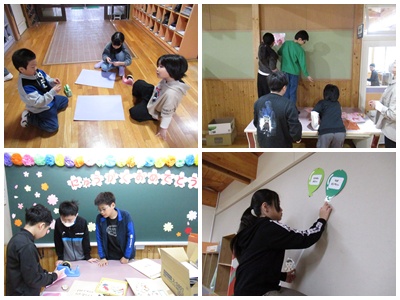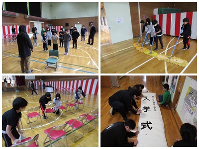体育館や1年生の教室の飾りつけなど児童が協力して行いました。