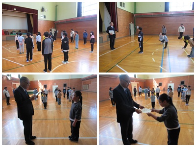 表彰では、5年男子児童が剣道の昇級試験で5級に合格した